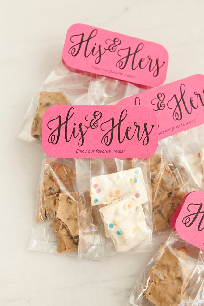 Couples blend their favorite treats together in these insanely easy chocolate bark bags. Your guests will be begging for more!