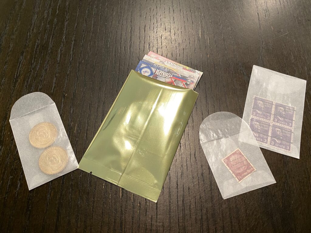 Many people find collecting stamps enjoyable. This hobby is definitely enhanced through organization. Stamps are tiny. When it comes to loose, small stamps, our glassine envelopes, are just the right size. Perfect for temporary and quick safe keeping, these envelopes are open ended with no adhesive on the top. If you are looking for a small bag with an adhesive closure, our Crystal Clear Bags are the clear choice. These bags are durable, archival safe and acid free. Both of these options come in packs of 100 and will keep those loose, small items safe and orderly.