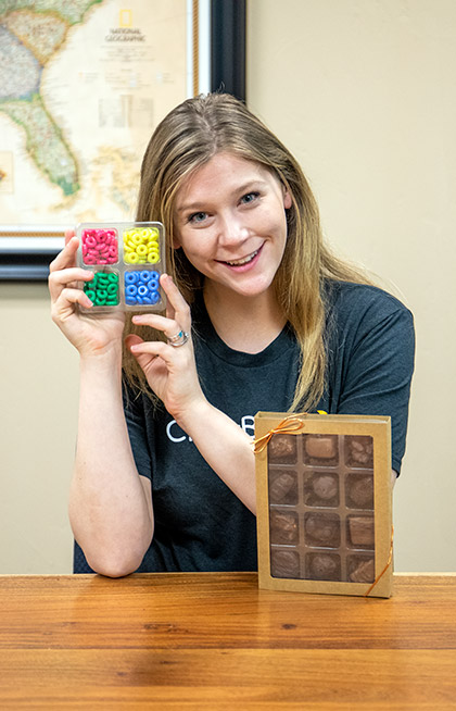 The base of the Candy Tackle Box is made from 28 mil food safe material. The base is designed with thermoform pockets, or cavities. Each of these cavities measure 1 1/2″ x 1″ x 1 /2″ in size, and feature a textured bottom. Along the top edge of the base is a little ridge that allows the patent pending lid to snap into place for a tight, secure closure. This makes these Candy Tackle Boxes air tight.