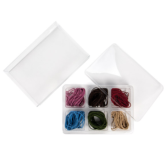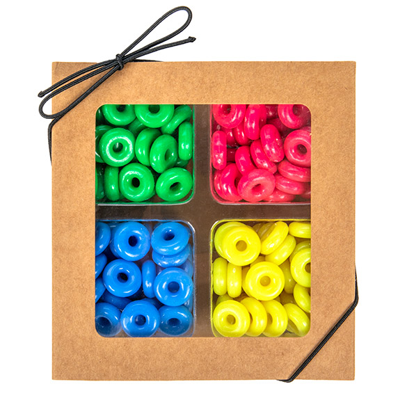 Another great accessory for the Candy Tackle Boxes is our stretch loop. Stretch loops are available in either vinyl or elastic options. The elastic stretch loops are offered in multiple colors and come with a pre-tied bow. The vinyl stretch loops are a frosted clear color. Adding a stretch loop will make your final product “retail ready” or a great gift box.
