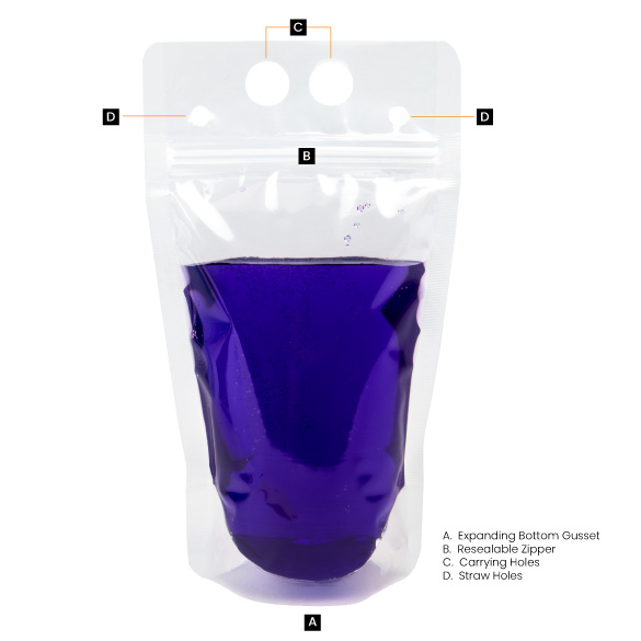 Pouches can be easily filled with 14oz of liquid (up to 158 degrees Fahrenheit) and feature a strong resealable zipper. Simply pour in your drink of choice, seal the zipper, slide your favorite straw into the small holes, and head out the door. Pouches are a safe option poolside or at the beach, so there is no worry of broken glass.