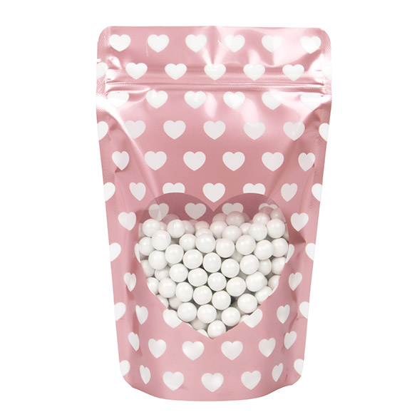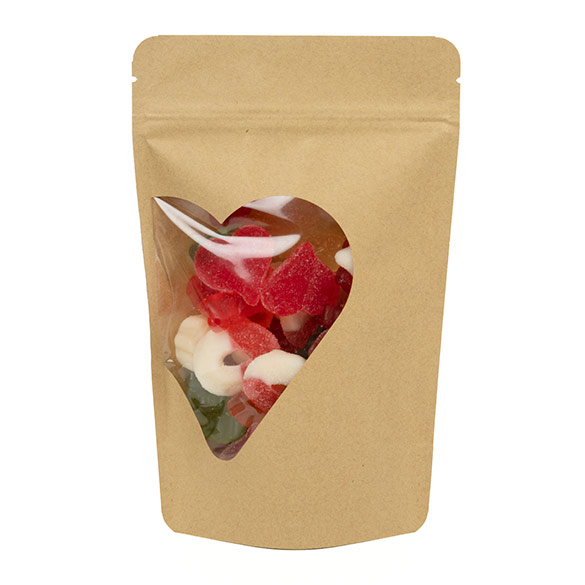 Our hearts (and warehouse shelves) are full of love for this holiday. To start, we have a simple kraft pouch that has a clear heart shaped window on the front. The heart is off centered, lending an artistic flair and providing a peek at the contents inside. Bright red, pink, and white candy really pops with the kraft material and are a sure way to say “Pick Me” this season. Item Number: ZBGW3KHT
