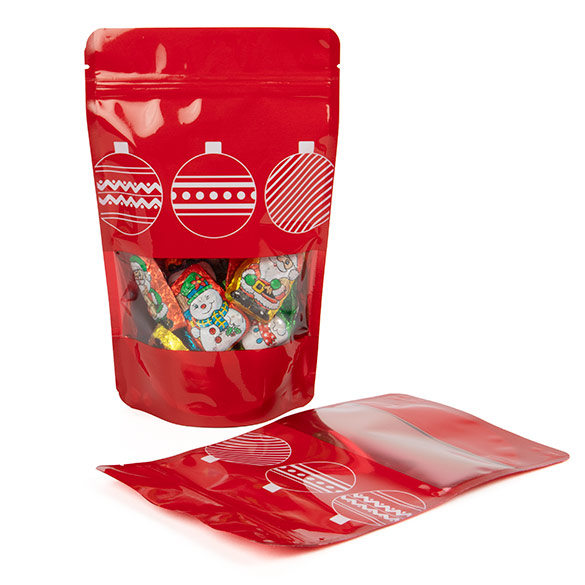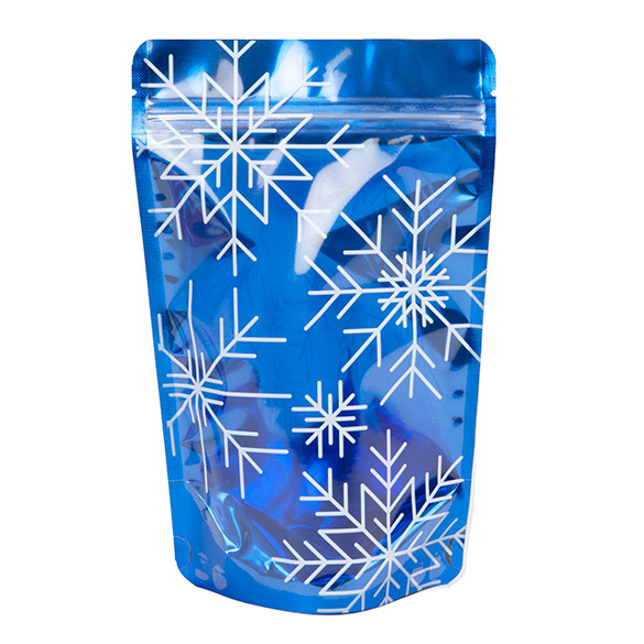 Let It Snow- Who doesn’t love a white Christmas?! This wintery pouch has a clear front panel that features snowflakes of all shapes and sizes. The inside and back panels are solid blue to complete the winter wonderland feel. Pack in candy, flavored marshmallows, cookies, brownies, and more. Item Number: ZBGSW3S