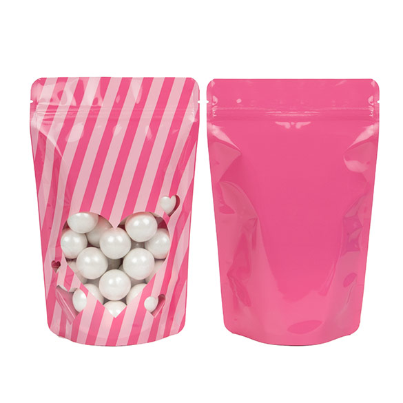 Coming Soon! We have two additional options coming soon. It has been said that opposites attract, and we would have to agree. These two bags complement one another with their contrasting designs. Try these bags out side by side on shelves for “his and her” goodies. The metallic mini hearts and extra large heart shaped window on the front of the bag get the point across, but to be sure we printed mini hearts on the back of the pouch as well. Item Numbers: ZBGSW3WH & ZBGSW3MH