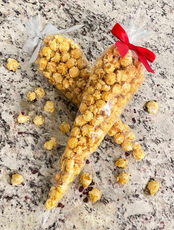 Our Round Bottom Gusset Bags have a food safe, white cardboard insert to keep the base flat, allowing the bag to stand on its own. The top can be heat sealed to ensure fresh, crispy corn or tied off with a ribbon or bow.