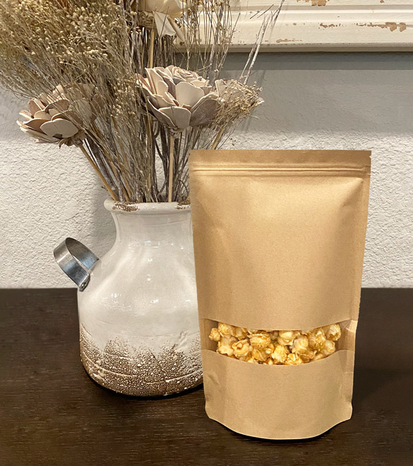 We know it sounds “corny” but our Stand Up Pouches are an “a-maize-ing” choice to stand out in a retail environment. Available in Rice Paper, Kraft, Glitter, and Metallic materials, you can easily add your logo via stamp or label as a personal touch. Many of our zipper bags come with an optional rectangle or oval shaped window or a completely clear front to let your beautiful chocolate-drizzled or caramel colored popcorn be the main selling point!