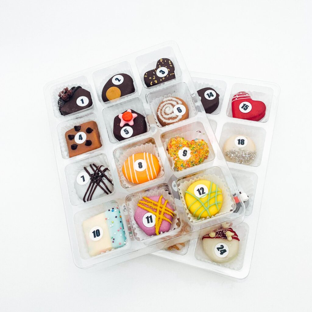 We love what Daisy Pops does each year with these Candy Tackle boxes. These bite sized cakes fit perfectly in the candy box sets and the Kraft Slip Cover and metallic stretch loops give these advent calendars an upscale finished look. Candy Tackle Boxes come in a variety of quantity options– Daisy Pops used 2 of our 12 cavity boxes for 24 cake bites!