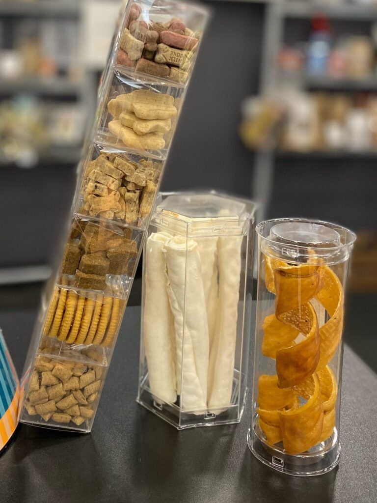 Nested Box Sets (NBS2 pictured on the left) is a fun and unique way to package a variety or set of treats, toys, and more! Decorative Tubes (CTHS36 pictured in center and CTRS26 pictured on right) are easy to assemble and give a 360° view of bones, toys, or other treats.