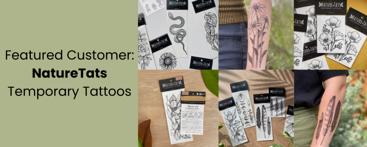 We use ClearBags to individually package our temporary tattoos, then we staple our custom paper hang tag label to the top.