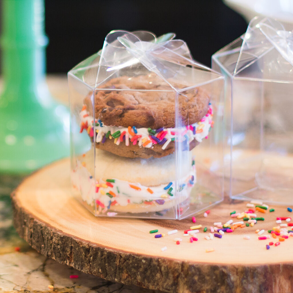 For special occasions or gifts, Decorative Top Boxes provide an elevated packaging look to classic chocolate chip cookies or yummy treats like these cookie sandwiches!